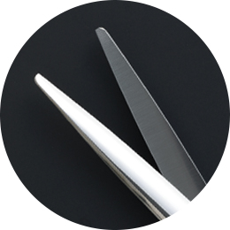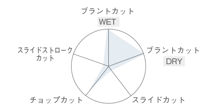幅広の刃による力強い切れとコバルト鋼材のもつ特性(なめらかさ)をバランス良く組み合わせることによって、「BB」「LINE」「ZIG」ほどには髪をとらえない、ソフトな切れ味となっています。Wetブラント・チョップカットがなめらかに切りやすく、カットラインの質感もソフトに仕上がります。