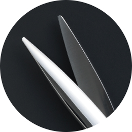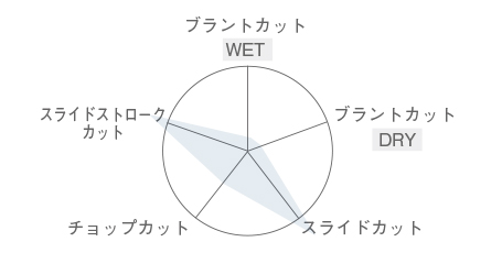髪をとらえて切るブラントシザーと異なり、髪を自然に逃がしながら切れるのでスライドカットが簡単にできます。