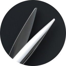 髪をとらえて切るブラントシザーと異なり、髪を自然に逃がしながら切れるのでスライドカットが簡単にできます。
